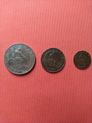 Se venden tres monedas de la Primera República Española: una de 5 céntimos, otra de 2 céntimos y una de 1 céntimo. Las monedas muestran pocas señales de desgaste por el paso del tiempo. - Monedas antiguas de colección. - Piezas históricas de la Primera República Española. - Ideales para coleccionistas.
