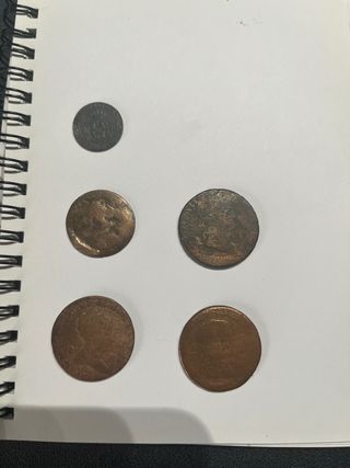 Se venden cinco monedas antiguas de cobre. - Dos monedas de 8 maravedís de Fernando VII. 1823 segovia y otra con fecha y ceca no visible. muy desgastadas. - Tres monedas de Isabel II. 8 maravedís de 1844 ceca segovia. BC. 4 maravedís, fecha y ceca no visibles, muy desgastada. 1 céntimo de escudo 1867 ceca Barcelona OM. EBC. Precio por el lote.