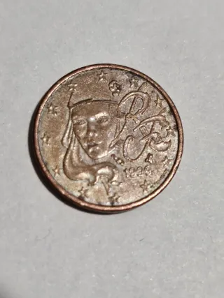 Moneda de 1 Euro de Francia conmemorativa. Moneda original de 1 céntimo, FR, 1999. - Diseño con Marianne. - Año de acuñación: 1999. - Borde con estrellas.