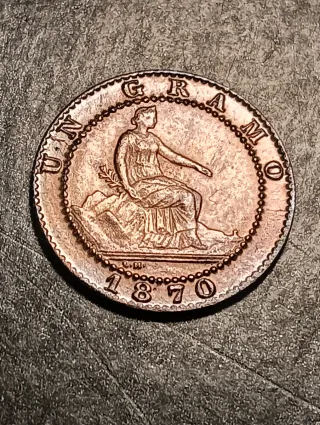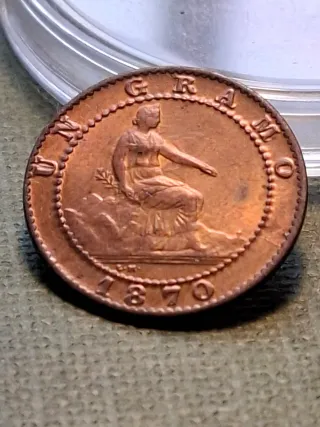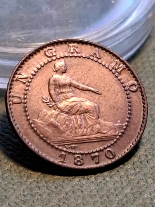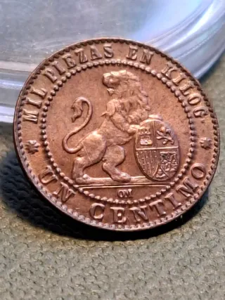 Moneda de 1 céntimo del año 1870 del Gobierno Provisional. Presenta un diseño con un león rampante sosteniendo un escudo. Nueva sin circular. - Canto con inscripción: MIL PIEZAS EN KILOG. UN CENTIMO - Material: Cobre o bronce.