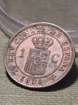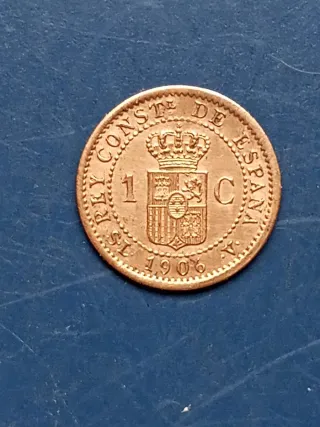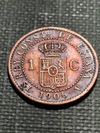 Moneda de 1 céntimo de Alfonso XIII, acuñada en el año 1906. - Anverso: Retrato de Alfonso XIII. - Leyenda: ALFONSO XIII POR LA G. DE DIOS. - Reverso: Cifra 1 y año 1906 rodeados de leyendas. - Material: Cobre.