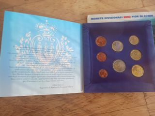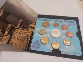 Conjunto de monedas de San Marino del año 2003. Divisional, de 1 céntimo a 2 euros, más moneda de plata de 10 euros. En cartera original