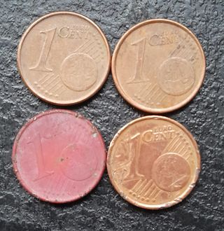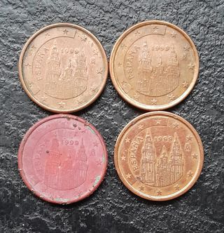 Lote de cuatro monedas de 1 céntimo de Euro de España, acuñadas en el año 1999. Escucho ofertas.