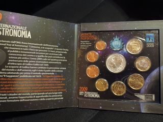 Conjunto de monedas de San Marino del año 2009. Cartera de 8 valores dedicada al año internacional de la astronomía. 1 céntimo a 2 euros. Inlcuye medalla conmemorativa de plata de 5 euros. En cartera original