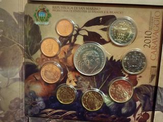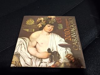 Conjunto de monedas de San Marino del año 2010. Cartera de 8 valores dedicada a Caravaggio. 1 céntimo a 2 euros. Incluye medalla conmemorativa de plata de 5 euros. En cartera original