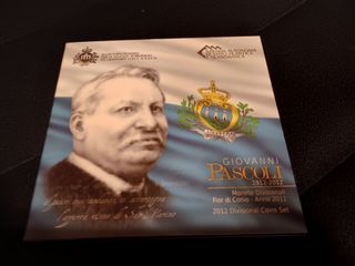 Conjunto de monedas de San Marino del año 2012. Cartera de 8 valores dedicada a Giovanni Pascoli. 1 céntimo a 2 euros. Incluye medalla conmemorativa de plata de 5 euros. En cartera original