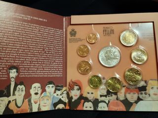 Conjunto de monedas de San Marino del año 2009. Cartera de 8 valores dedicada a Federico Fellini. 1 céntimo a 2 euros. Incluye medalla conmemorativa de plata de 5 euros. En cartera original