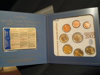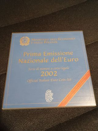 Carpeta oficial de la Primera Emisión Nacional del Euro en Italia del año 2002. Contiene una serie de monedas de curso legal. 8 en total, de 1 céntimo a 2 euros en cartera original