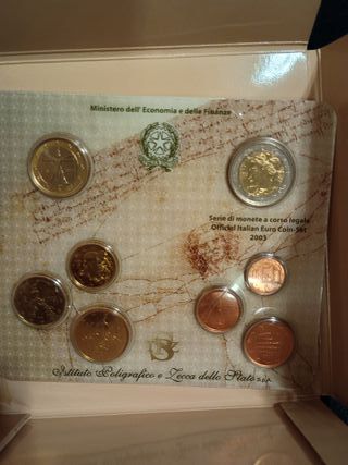 Carpeta oficial de monedas de curso legal de Italia del año 2003. Incluye monedas de 1 céntimo a 2 euros, ocho en total. En cartera original