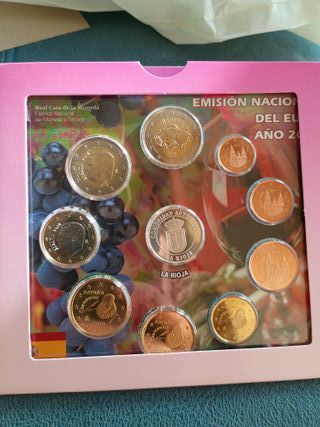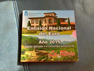 España Cartera oficial de FNMT del año 2015, serie dedicada a las Comunidades Autónomas, Comunidad Autónoma de La Rioja Aparte de la medalla de la comunidad, 8 monedas, de 1 céntimo a 2 euros €, y moneda de 2 euros conmemorativa de las Cuevas de Altamira
