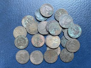Una de las monedas de la imagen. 1 Céntimo 1870. En el reverso se ve la leyenda "MIL PIEZAS POR KILOG.", ya nos indica que cada pieza pesa 1 gramo y tiene un diámetro de 15 mm. Tiene 153 años de historia.