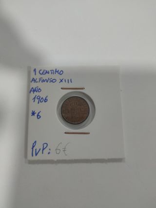Moneda de 1 céntimo de España del año 1906, con la efigie de Alfonso XIII. Se envía la moneda que aparece en las fotografías.