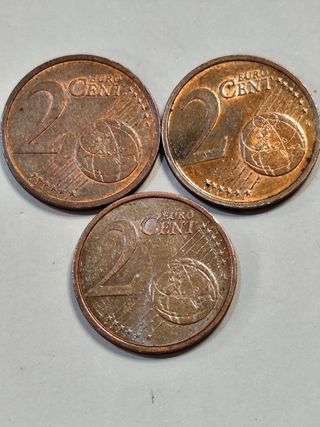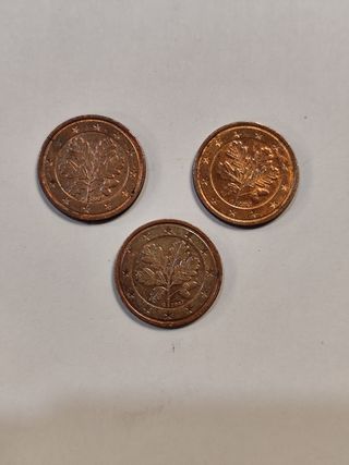 Lote tres es monedas 2002 Alemania 1 Céntimo CECA A,Ceca G,Ceca J Con errores en acuñaciones de las estrellas y exceso de metal