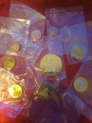 Todas en su bolsa tiene de un centimo a los 5 euros 1,2,5,10,20,50,1euro,2euros y 5 euros