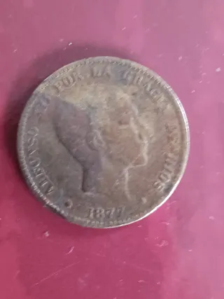 Moneda de 10 céntimos de Alfonso XII, acuñada en el año 1877. - Anverso: Retrato de Alfonso XII. - Leyenda: ALFONSO XII POR LA GRACIA DE DIOS. - Reverso: Cifra 10 y año 1877.