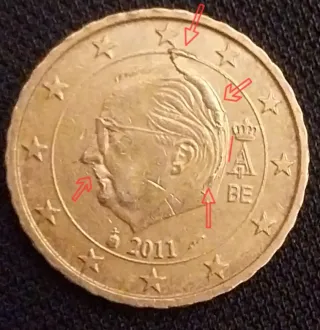 Moneda de 10 céntimos de Bélgica del año 2011 con un error de cuño. - Presenta una rotura en el cuño. - Diseño con el retrato del rey y estrellas. - Símbolos de la Casa de Moneda de Bruselas.