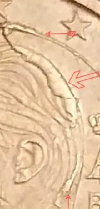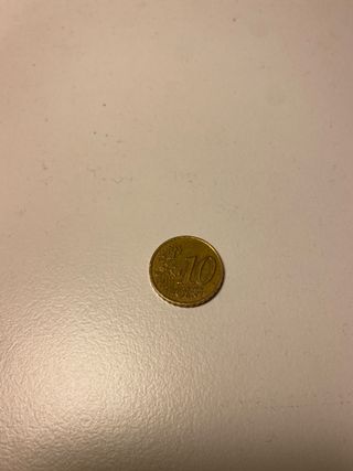 Moneda de 10 céntimos de Euro con un defecto de acuñación. - Presenta un daño visible en el borde. - Marcada con un círculo rojo y una flecha en las imágenes. Escucho ofertas.
