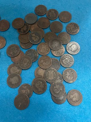 Conjunto de monedas antiguas de bronce o cobre. Cada moneda presenta un diseño detallado. Monedas españolas del siglo XIX principalmente: Tipos identificables: - 5 y 10 centimos. - Govierno provisional / Alfonso XII / Alfonso XIII. - Años aprox: 1870 - 1890. Ejemplos visibles: “Diez céntimos de peseta” “Cinco céntimos de peseta” Escudo con castillos y leones Retratos muy gastados Diseño: Grabados históricos. SE VENDE TODO EL CONJUNTO!