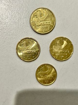 4 monedas de Andorra: - Moneda de 50 céntimos, año 2021. - Moneda de 10 céntimos, año 2020. - Moneda de 20 céntimos, años 2019, 2022.
