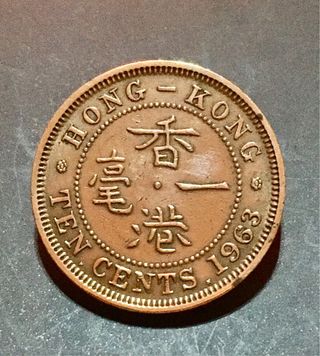 Moneda de 10 céntimos de Hong Kong del año 1963. - Anverso: Retrato de la Reina Isabel II. - Reverso: Valor y nombre de la colonia. - Material: Bronce.