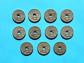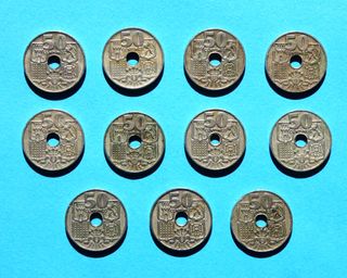 13 monedas de 50 céntimos de España, año 1949, estrella *53, circuladas, cuproníquel, diámetro 20mm, peso 4g, agujero en el centro, flechas apuntan arriba. No hago envíos por importe total inferior a 6 euros. Puedo agrupar artículos en una oferta/un envío. -