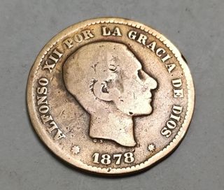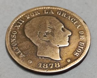 Moneda de 5 céntimos de Alfonso XII, acuñada en el año 1878. - Anverso: Retrato de Alfonso XII. - Leyenda: ALFONSO XII POR LA GRACIA DE DIOS. - Reverso: Cifra 5 y año 1878.