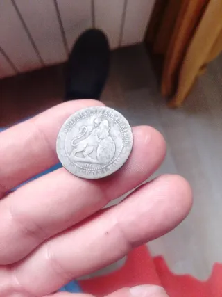 Moneda de 5 céntimos de 1870. - Diseño con león rampante y escudo. - Inscripción en el borde.