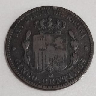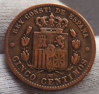 Moneda de cobre con valor facial de 5 céntimos, acuñada en España durante el reinado de Alfonso XII. Bonita pieza en una conservación bastante buena para este tipo de cobres. Más monedas en mi perfil. Se hacen envíos combinados para ahorrar en gastos de envío.