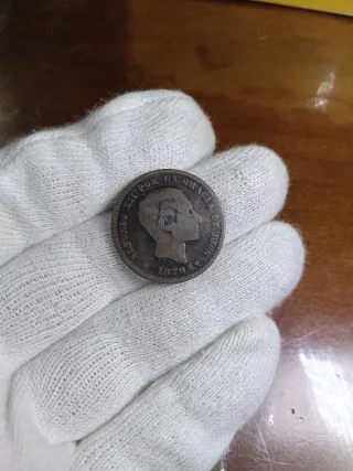 Moneda de 5 céntimos de Alfonso XII, acuñada en 1877. Se encuentra en buen estado de conservación, aunque presenta señales del paso del tiempo. - Moneda de cobre. - Fecha de acuñación: 1877. - Retrato de Alfonso XII.
