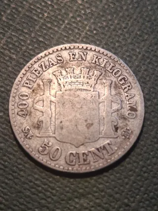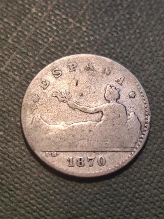 Escasa moneda de 50 céntimos del Gobierno Provisional del año 1870. Una pieza escasa para coleccionistas. - Diseño con figura alegórica. - Inscripción ESPAÑA en la parte superior.