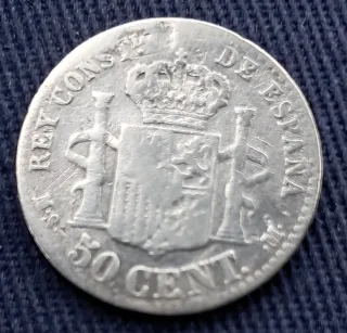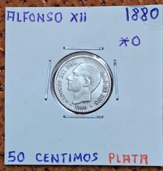 Moneda de Alfonso XII de 50 céntimos de plata acuñada en 1880. - Canto: Estrellas y número. - Leyenda: ALFONSO XII POR LA G. DE DIOS 1880.