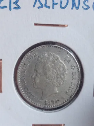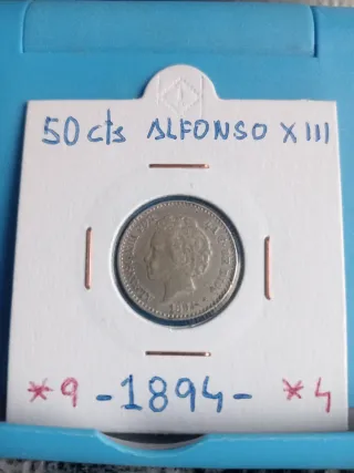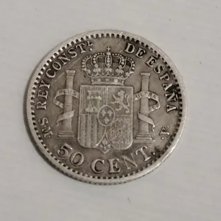 Moneda de 50 céntimos de Alfonso XIII, año 1894. - Ceca: Madrid - Metal: Plata - Diámetro: 18 mm - Peso: 2.5 gramos