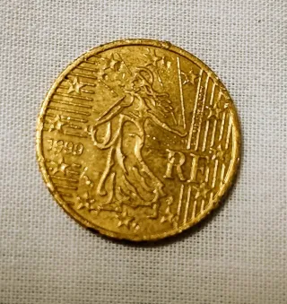 Moneda de 50 céntimos de Francia con fecha de 1999. - Diseño de la moneda de 50 céntimos de euro. - Acabado metálico dorado.