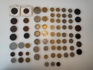 Lote de 60 monedas españolas de 50 céntimos del año 1949. Cada moneda presenta un diseño circular con un agujero en el centro. - 60 unidades incluidas. - Año de acuñación: 1949. - Denominación: 50 céntimos. - Origen: España.