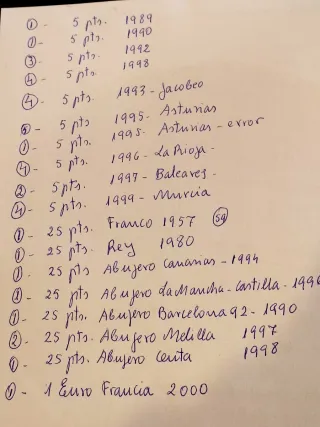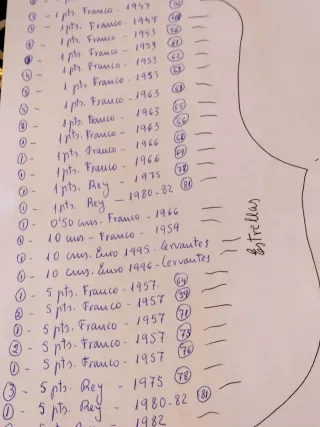 Lista de monedas para coleccionistas. - Monedas de Franco de 1947, 1953, 1963 y 1966. - Monedas de Rey de 1975 y 1980-82. - Monedas de 0'50 y 10 céntimos. - Monedas de 5 pesetas de 1957. - Monedas de Euro de 1995 y 1996 (Cervantes). - Incluye números de catálogo o referencia.