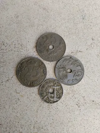 Conjunto de cuatro monedas antiguas. -tres monedas de 25 céntimos. -una monedas de 50 céntimos. Años 1949, 1937, 1927, 1925.