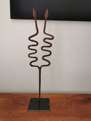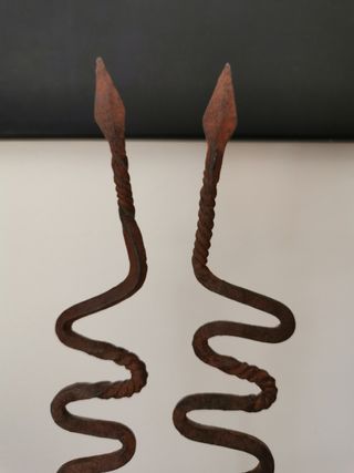 Moneda antigua de hierro negro, usada tradicionalmente en la cultura chamba para las transacciones comerciales.