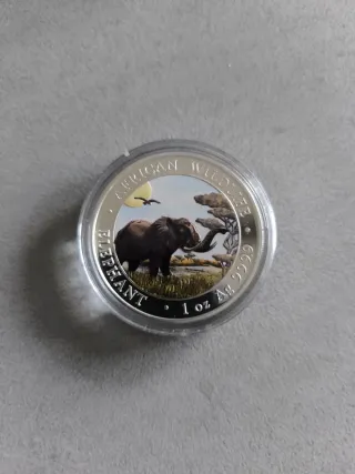 Moneda de plata de elefante africano, colección Elefante Somalia 2017 tamaño 2 Oz. Gran valor numismatico por ser también la primera de la colección. - Diámetro grande. - Peso: 2 oz. - Pureza: 999.9 de plata. - Diseño de vida silvestre africana. - Cápsula Original.