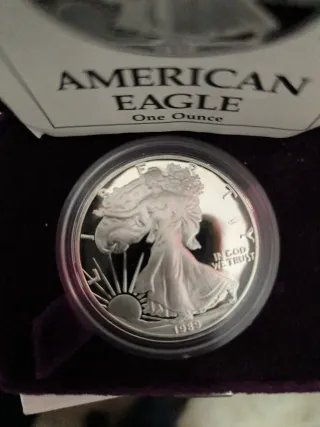 Moneda de plata Águila Americana de una onza, edición de 1989 Ceca Philadelphia 1000 ejemplares Certificado de autenticidad - Diseño Walking Liberty. - Acabado profesional (Proof). - Incluye estuche.