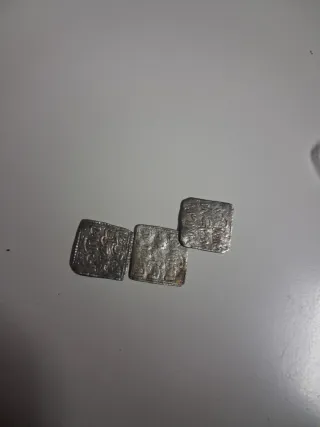 Conjunto de tres monedas antiguas de origen islámico. Cada moneda presenta inscripciones y diseños detallados. - Tres monedas - Diseño cuadrado con escritura árabe. - Piezas de colección. Escucho ofertas
