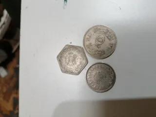 Conjunto de tres monedas antiguas de Egipto. Cada moneda tiene un diseño distintivo. - Moneda hexagonal. - Moneda circular con número 5. - Moneda circular con diseño árabe.