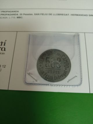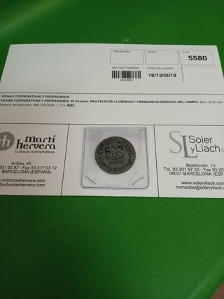 Antigua ficha de la Hermandad Sindical del Campo *San Feliu de Llobregat* con valor de 25 pesetas ,utilizada en el Borne de Barcelona (Emisión de Posguerra),con el n° 588 de agricultor,pieza catalogado por Antoni Lopez i Lluch en Les Monedas de les Cooperativas Catalanes con el n° 715,pieza escasa de conseguir,comprada en subasta en 2018 como se ve en certificado,envío la pieza de la imagen acuñada en zinc con un diámetro de 30 mm.,envío por correo certificado por cuenta del interesado, acepto bizum ó transferencia, ofertas no gracias,como indica el certificado de subasta la pieza es escasa.