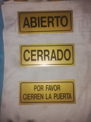 ENVIO X CORREOS! MAS PLACAS EN MI PERFIL! ¡3 PLACAS X 1€! CUALQUIER PLACA DE MIS ANUNCIOS. PLACAS ALUMINIO 0,5mm DORADO, COLOR ORO. MEDIDAS: 21 X 8.5 cm PESO 24 GRAMOS. ABIERTO 9 UD CERRADO 13 UD POR FAVOR CIERREN 7 UD RESTAURANTE 24 UD CAFETERIA 22 UD BAR 7 UD Señal, placa, aseos, wc, sala espera, abierto, cerrado, tirar, cafeteria, restaurante, obra, oficina, reventa, oferta, Moneda, peseta, Franco, España, rey, lote, bronce, historia, año, siglo, dolar, consola, juego, antiguo, plata, oro, cobre, metal, madera, camping, mesa, silla, movil, montaña, bici, coleccion, camiseta, disney, libro, dvd, linterna, led, llavero, pin.