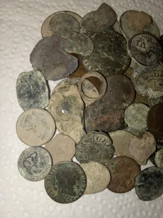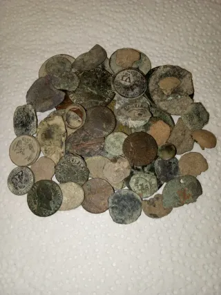 Lote de 52 monedas antiguas, ideales para coleccionistas y aficionados a la numismática. Requieren limpieza para revelar su estado original. - Cantidad: 52 monedas. - Estado: Sin limpiar, con pátina y signos de la edad. - Material: Variado, predominio de bronce y cobre. - Origen: Diversos, de diferentes épocas y procedencias.