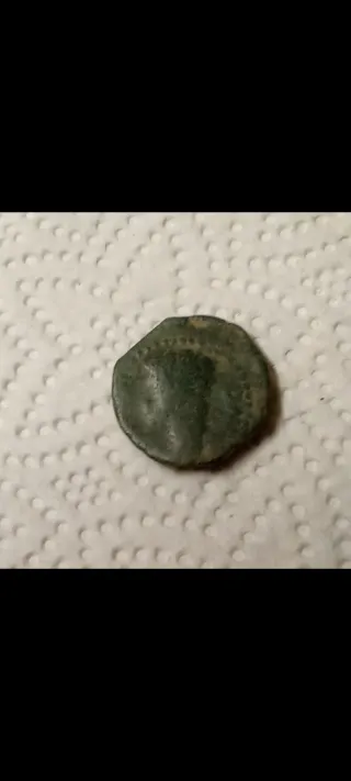 Moneda antigua de origen romano. Presenta un diseño desgastado por el tiempo. - Material: Bronce o cobre (apariencia). - Diseño: Grabado con motivos clásicos.