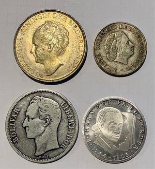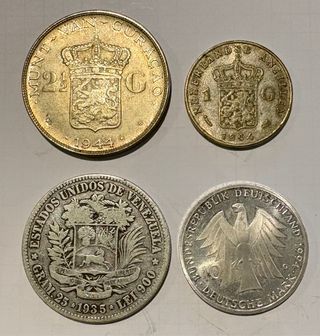 Conjunto de cuatro monedas antiguas, una de plata y tres de bronce. - Moneda de Venezuela: Estados Unidos de Venezuela, 1935, 25 Gramos, Lei 900. - Moneda de Curazao: Munt Van Curacao, 1944, 2 1/2 C. - Moneda de Antillas Neerlandesas: Nederlandse Antillen, 1964, 1 G. - Moneda de Alemania: Bundesrepublik Deutschland, 1964, 10 Deutsche Mark.
