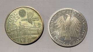 Conjunto de dos monedas antiguas, una de 2000 Pesetas y otra de 10 Deutsche Mark. - Moneda de 2000 Pesetas con imagen del Palacio de Cibeles en Madrid. - Moneda de 10 Deutsche Mark con águila federal alemana. - Ambas monedas son de plata.