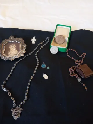 Conjunto de artículos religiosos: - 2 medallas de la Virgen de Fátima. Plata y esmalte azul. - Rosario antiguo de cuentas marrones (falta la cruz), con estuche de piel. - Rosario de herencia, muy antiguo, de filigrana de plata para restaurar (falta la cruz). - Cruz pequeña filigrana de nácar. - Medalla plateada. -Moneda de Juan Pablo II - Moneda antigua de 100 Liras italianas (Juan Pablo II). - Icono Virgen con niño. - Caja verde para joyas. Se vende el lote completo, 50€. En caso de querer sólo algunos de los artículos o añadir cualquier otro de mi perfil, pregúntame.