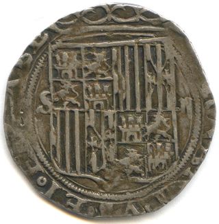 Moneda antigua con un diseño detallado de escudo. - Grabado de escudo con leones y castillos. - Borde decorado con motivos geométricos. 2 Reales de Plata (Tipo 36) del reinado de los Archiduques Alberto e Isabel. Época de los Reyes Católicos (1475-1504) Acuñación en Sevilla o Segovia Página 23 del Catálogo General de La Moneda Española Peso: 6,72 g Diámetro: 28 mm Metal: Plata