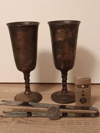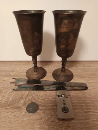 Conjunto de dos copas de estilo vintage con base y tallo retorcido, junto con un mechero y utensilios. - Dos copas con acabado plateado y detalles de desgaste. Valero silver plated made in Spain. - Un mechero de color plateado y el símbolo de la marca de coche mercedes - Unas pinzas de coger hielo de plata con la marca de Christofle Coll gailla made in France. - Una moneda antigua de dos pesetas de 1870. Más monedas estrangeras españolas de plata conmemorativas blisters etc.. en mi perfil